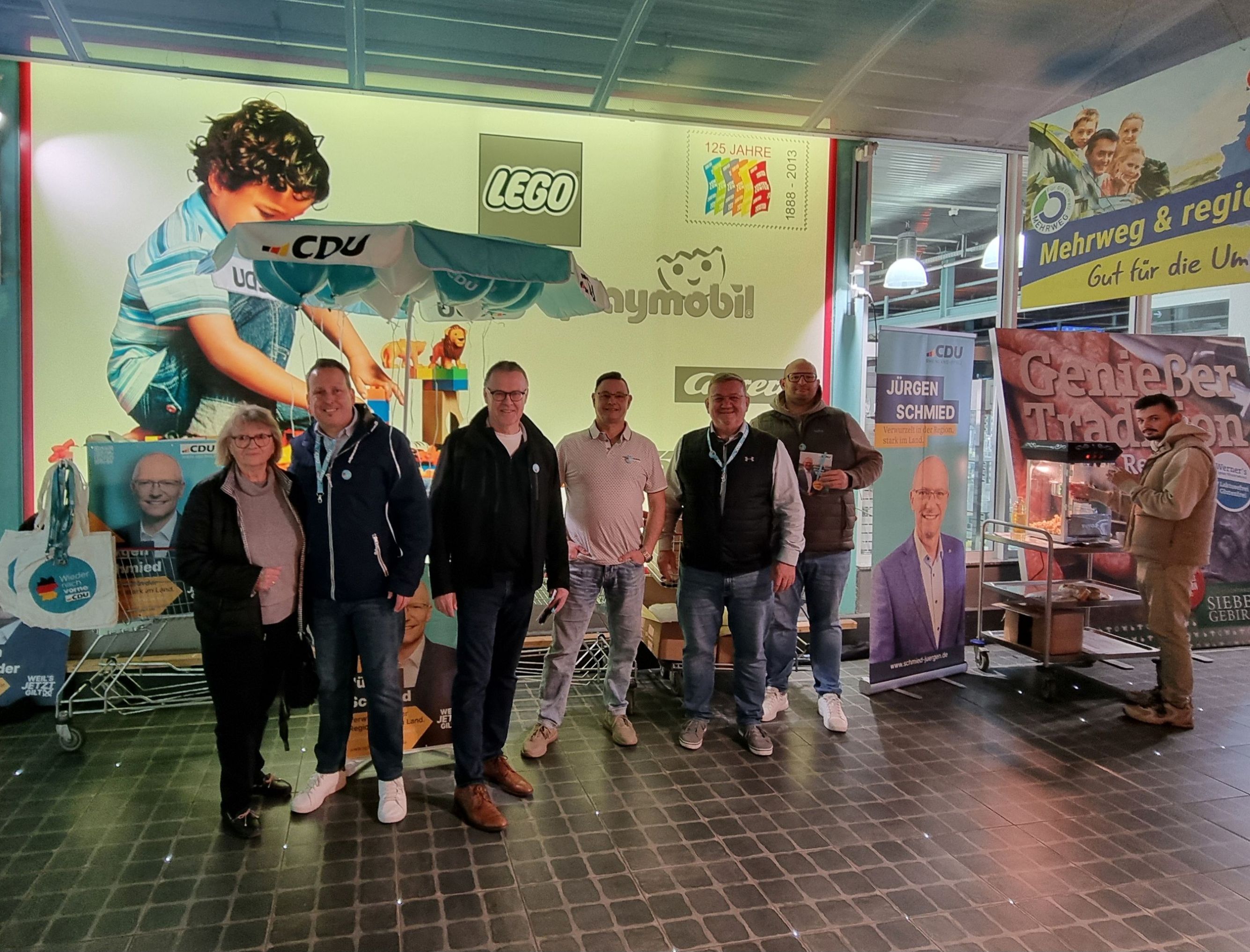 Im Vorfeld der Landtagswahlen fand am Samstag der erste Infostand der CDU am Vorteil-Center statt. Mitglieder der CDU-Vorstände aus allen vier Ortsverbänden und aus dem Gemeindeverband standen den Besucherinnen und Besuchern Rede und Antwort. Der CDU-Landtagskandidat Jürgen Schmied kam später dazu und informierte in einzelnen Gesprächen über sein persönliches Wahlprogramm. Im Landtag will er sich für die Verbesserung der Bildung durch frühe Sprachförderung in Kitas und Grundschulen, für Bürokratieabbau und Schaffung und Sicherung von Arbeitsplätzen, die Abschaffung der Straßenausbaubeiträge und die Stärkung der kommunalen Finanzen einsetzen.